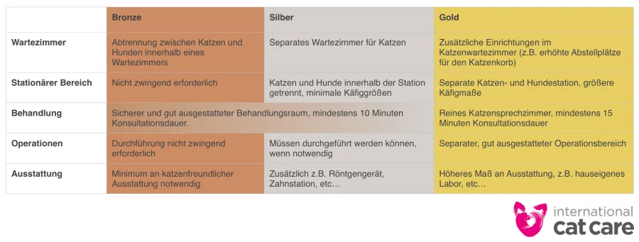 Die Vergabe der Akkreditierung ist an hohe Standards geknüpft, die eine Tierarztpraxis als Cat Friendly Clinic erfüllen muss, um den besonderen Bedürfnissen von Katzenpatienten zu entsprechen. Kriterien sind neben eigenen Praxisräumen für Katzen sowie der optimalen Unterbringung bei stationären Aufenthalten auch speziell geschulte Mitarbeiter.